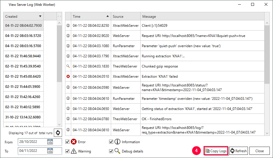 - Press CTRL + Shift + Lto open the Web Server logs.