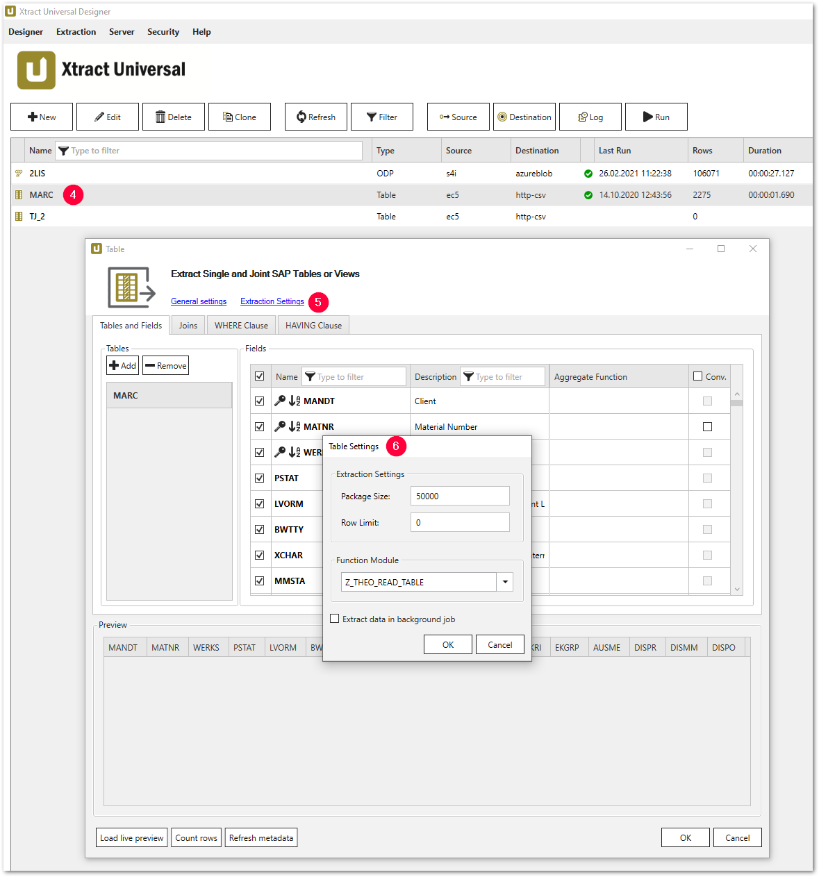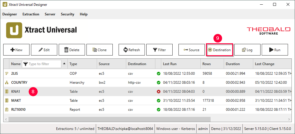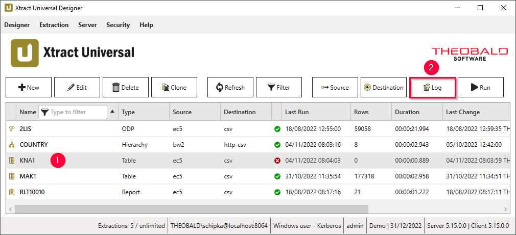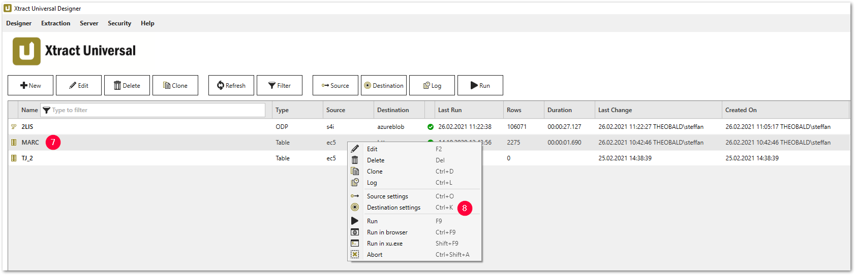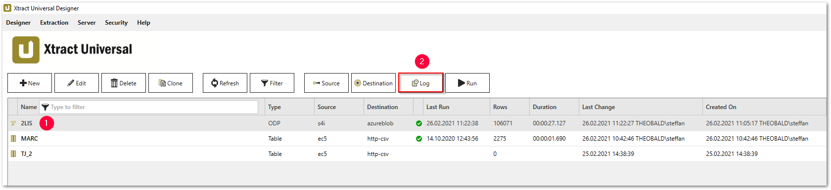 - Select the faulty extraction in the Xtract Universal Designer (1).