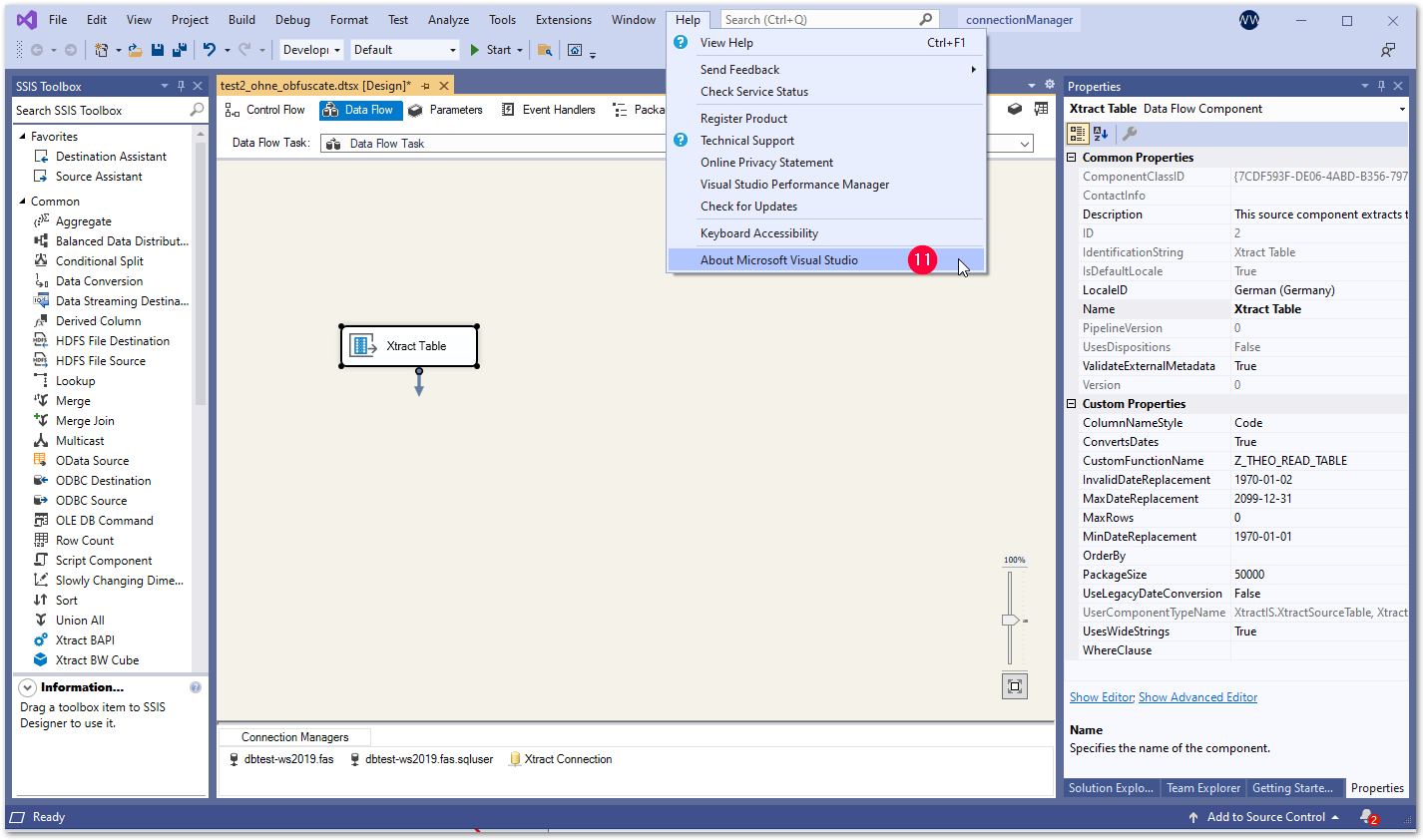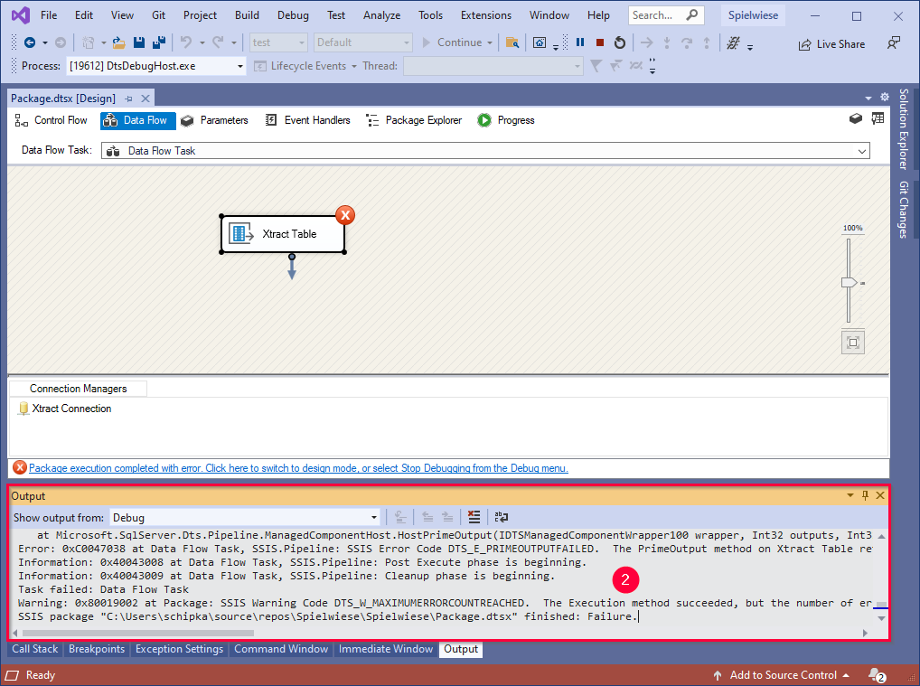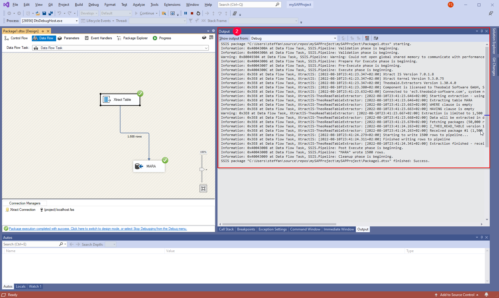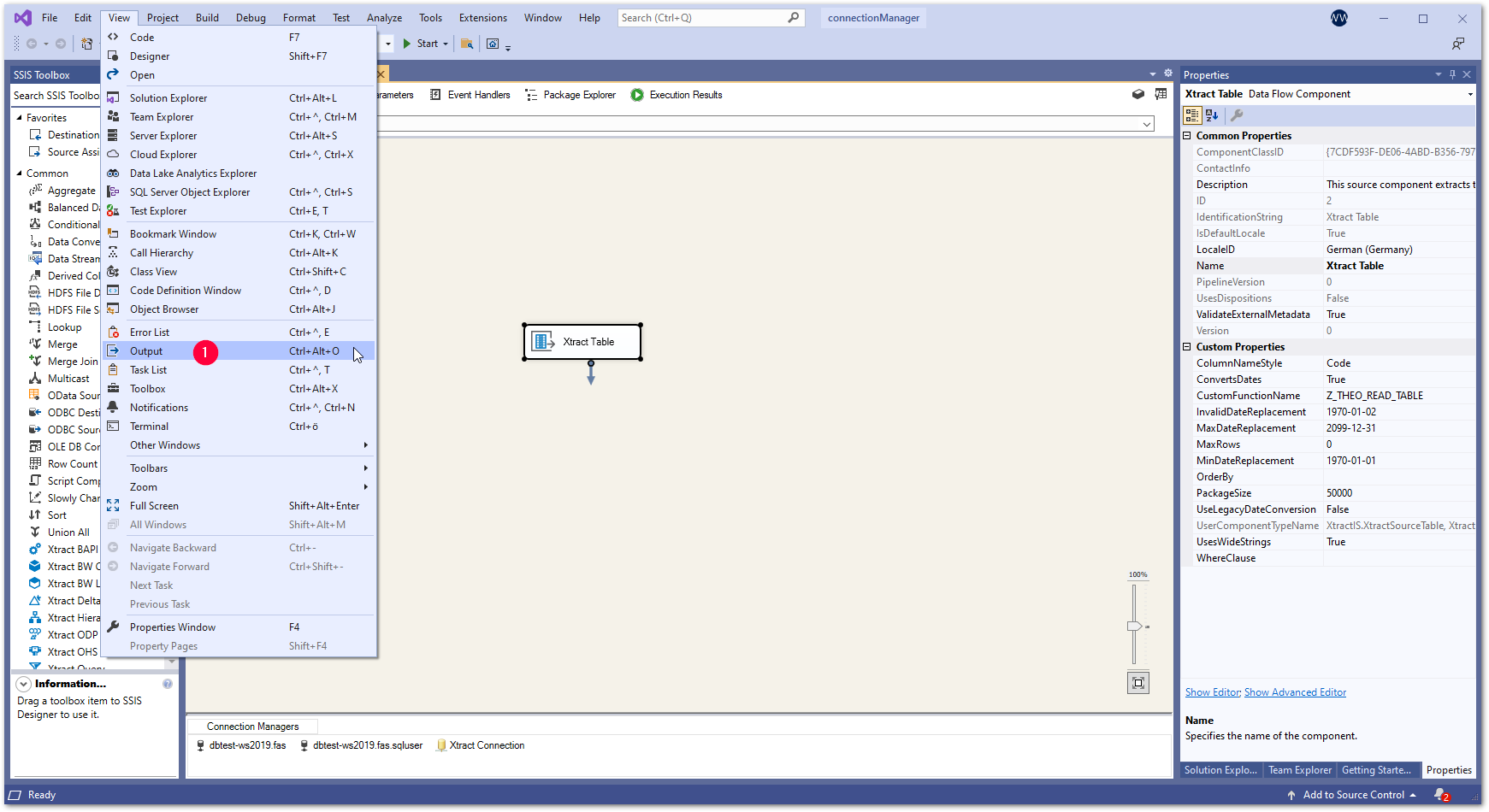 - Display the SSIS output windows within VS / SSDT using View > Output (1).