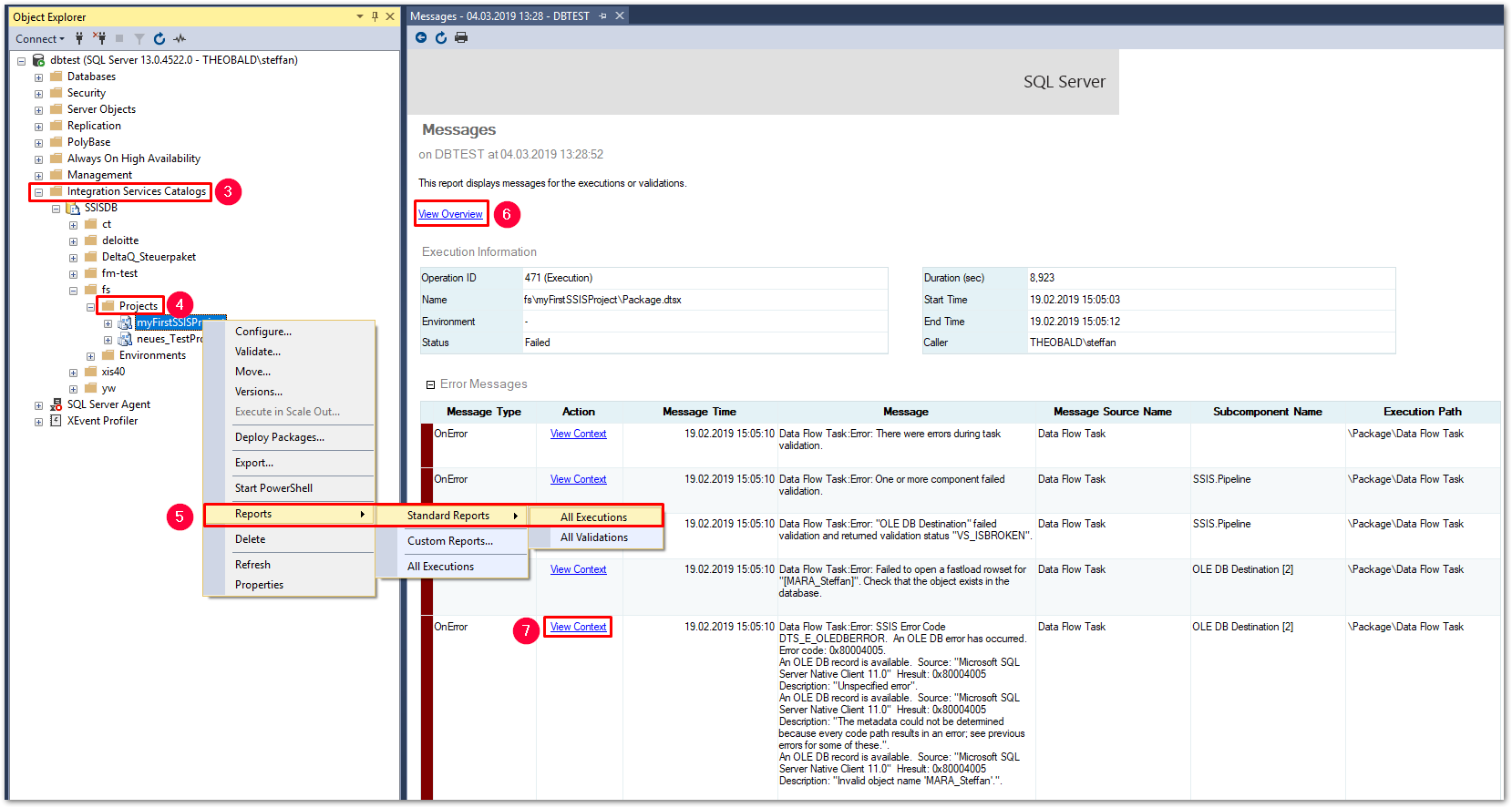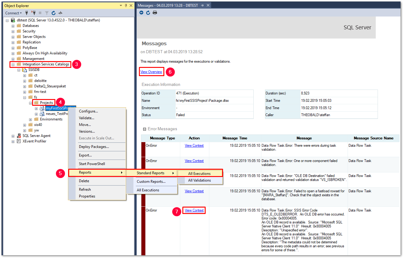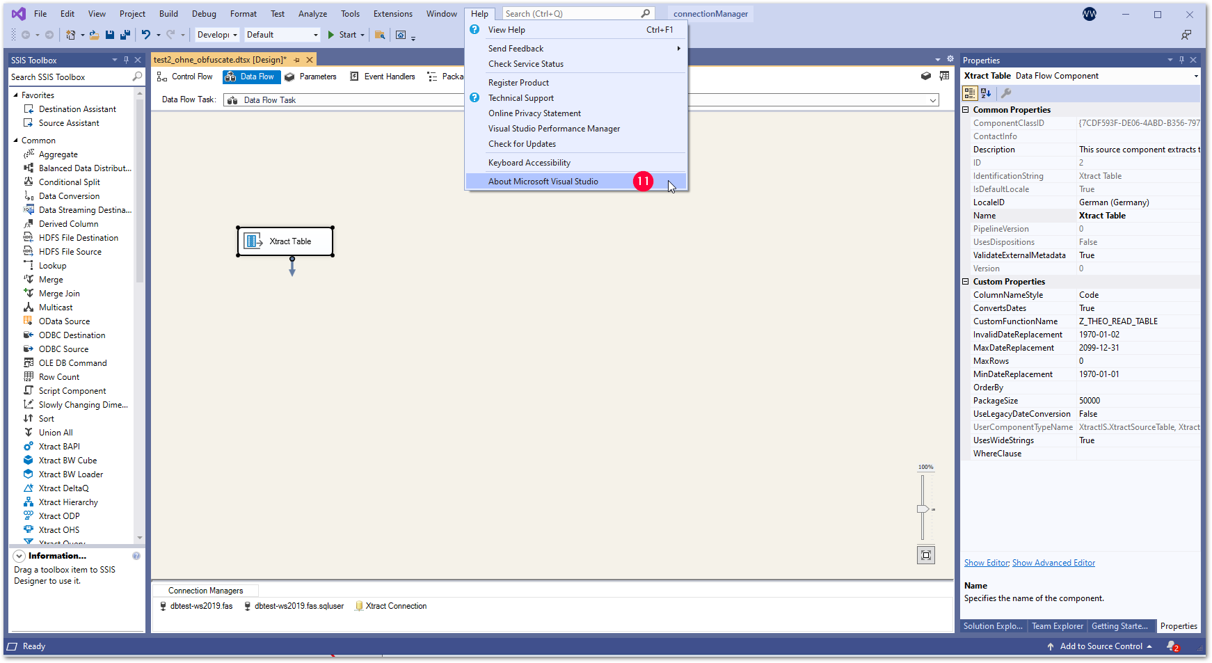 - Display the SSIS output windows within VS / SSDT using View > Output (1).
