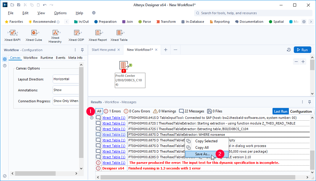 - Right-click in the result log section and select [Save As...] (2).