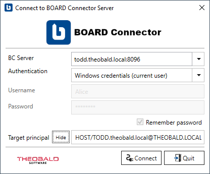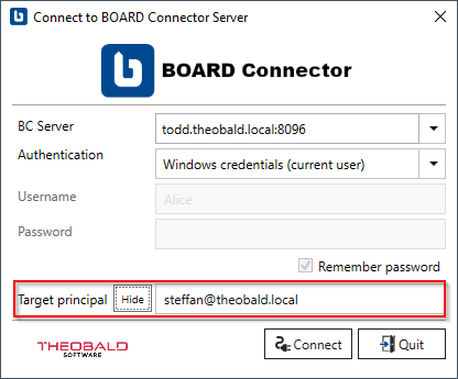 Note: The Target Principal only needs to be changed in the BOARDConnector Designer login window if the service account of the XU Windows Service has been changed.