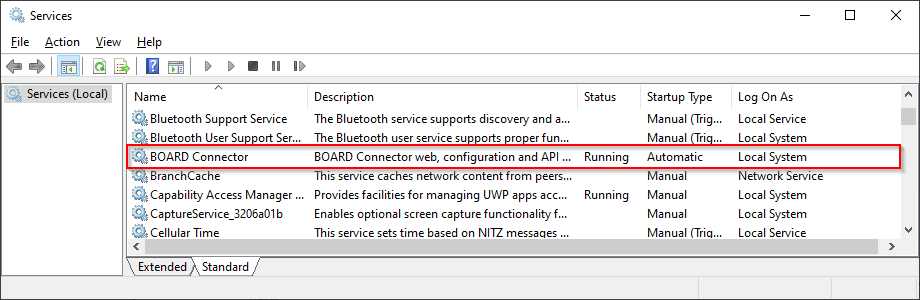The BOARDConnector server is a standard Windows service that runs under the Local System Account by default.