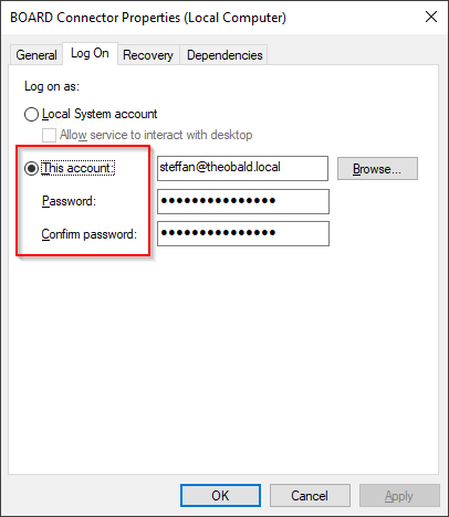 Note: After changing the user context of the Windows service, the UPN or SPN for logging in to the BOARDConnector server must also be adjusted.