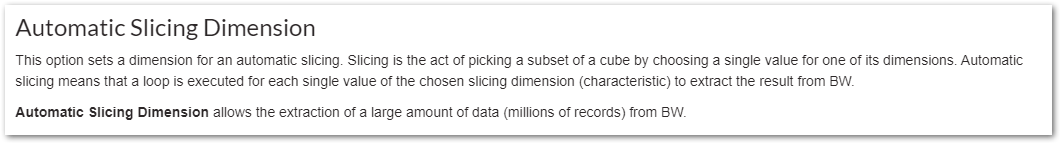 It is recommended to use a dimension as part of Slicing dimension. Choose a dimension that has not too many distinct values (say 0CALDAY) or too less values. It would be a good idea to choose a dimension that a good amount of distinct values (say 0COSTCENTER, 0PROFITCENTER or 0PLANT etc.,) so that smaller chunks of data based on the slicing dimension is requested from SAP. Thus avoids the memory issues at SAP