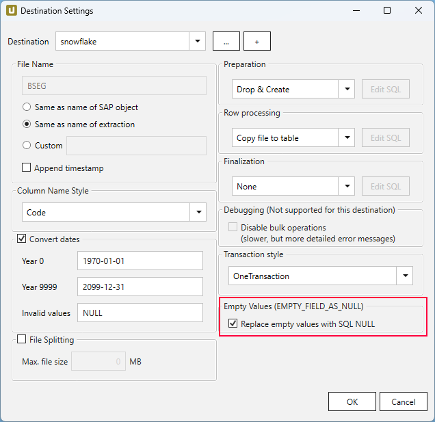 For any reason, an empty value exists in a primary key field in SAP. The default destination setting 'Replace empty values with SQL NULL' violates the DB constraint for a non-nullable column, see sample SQL error message from the Snowflake Query History section: