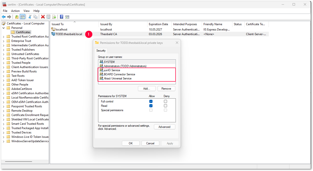If HTTPS is used, please ensure that the user context of the affected service is granted to read the X.509 certificate information, see sample screenshot:
